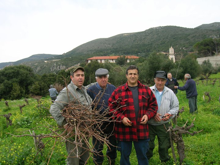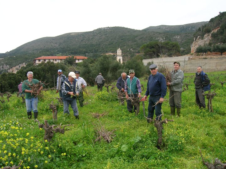 Μετά το κλάδεμα για να ξεκουραστούν ακολούθησε φαγητό με μπακαλιάρο πλακί στην κουζίνα του Μοναστηριού το οποίο συνοδευόταν με άφθονο κρασί.