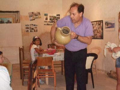 Ο Γεράσιμος Γαλανός με τον μοναδικό του τρόπο μαθαίνει τους μικρούς επισκέπτες πως χρησιμοποιούσαν την στάμνα οι πρόγονοί μας