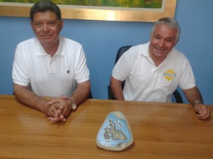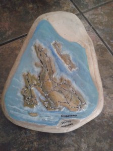 Μία πέτρα από τα Λαγκαδάκια, πάνω στην οποία είχε σμιλεύσει με μοναδικό τρόπο την Κεφαλλονιά και την Ιθάκη, προσέφερε στα αδέλφια Μαρούλη Βασίλη και Σπύρο του Καμινάρη ο κ. Μαρούλης Στέλιος του Παρασκευά και στολίζει από σήμερα το γραφείο τους.