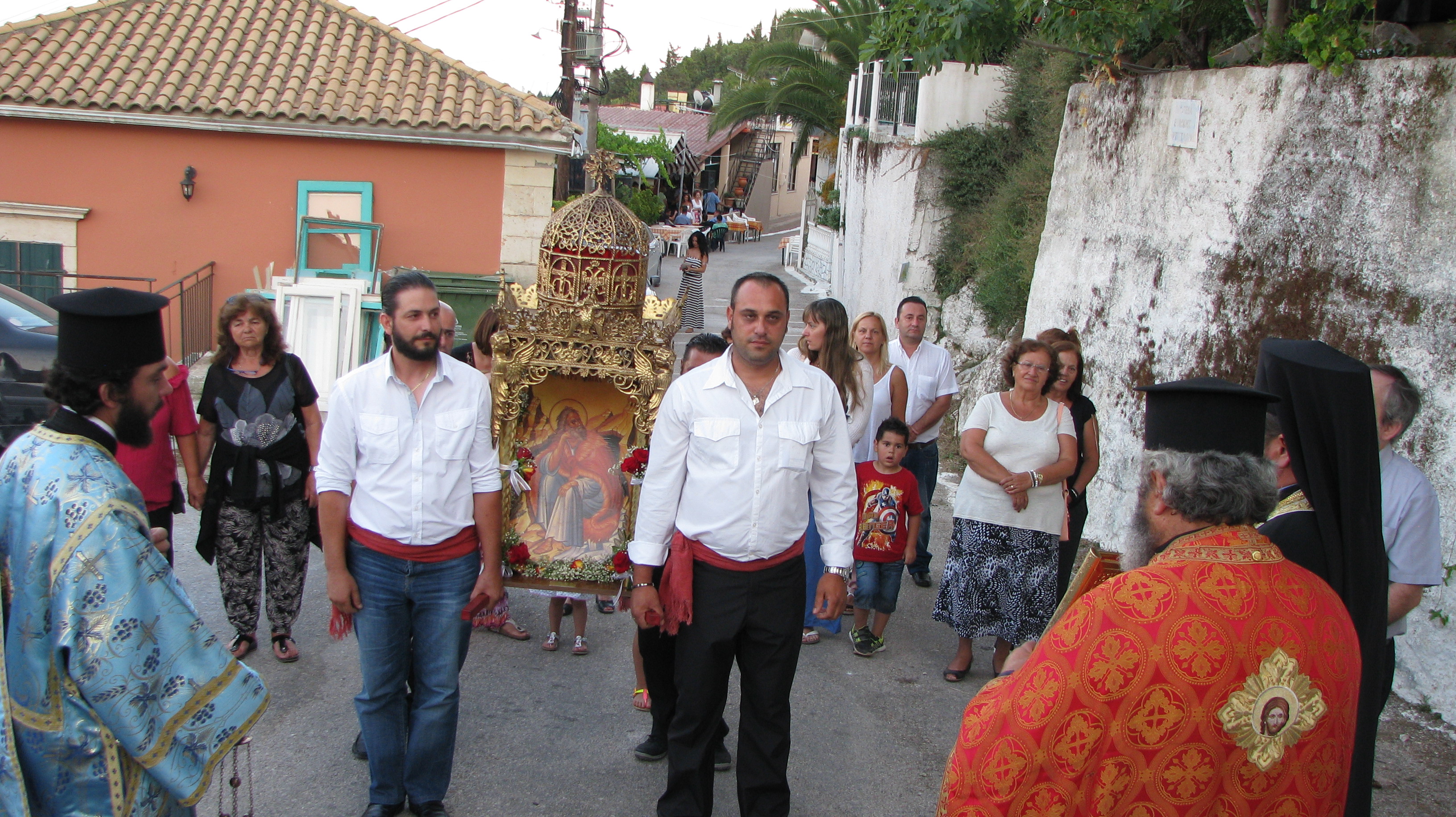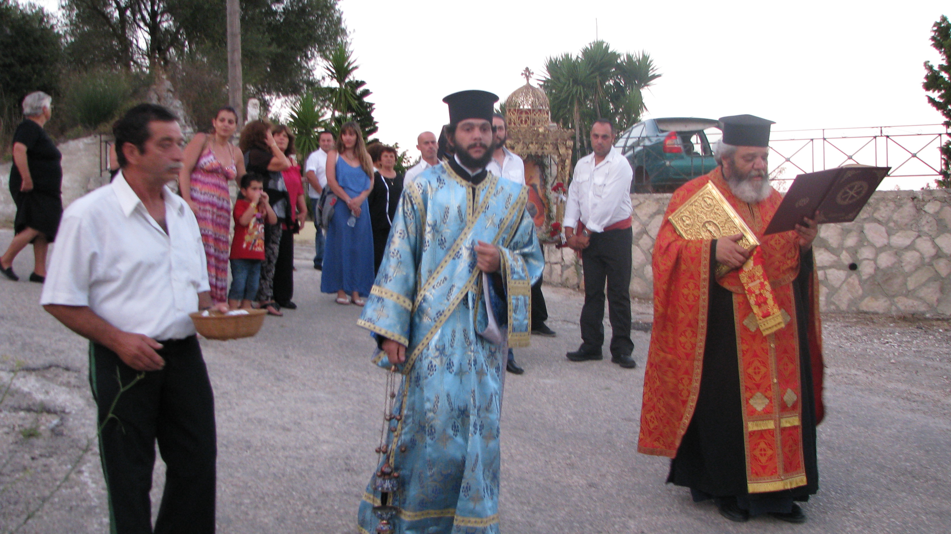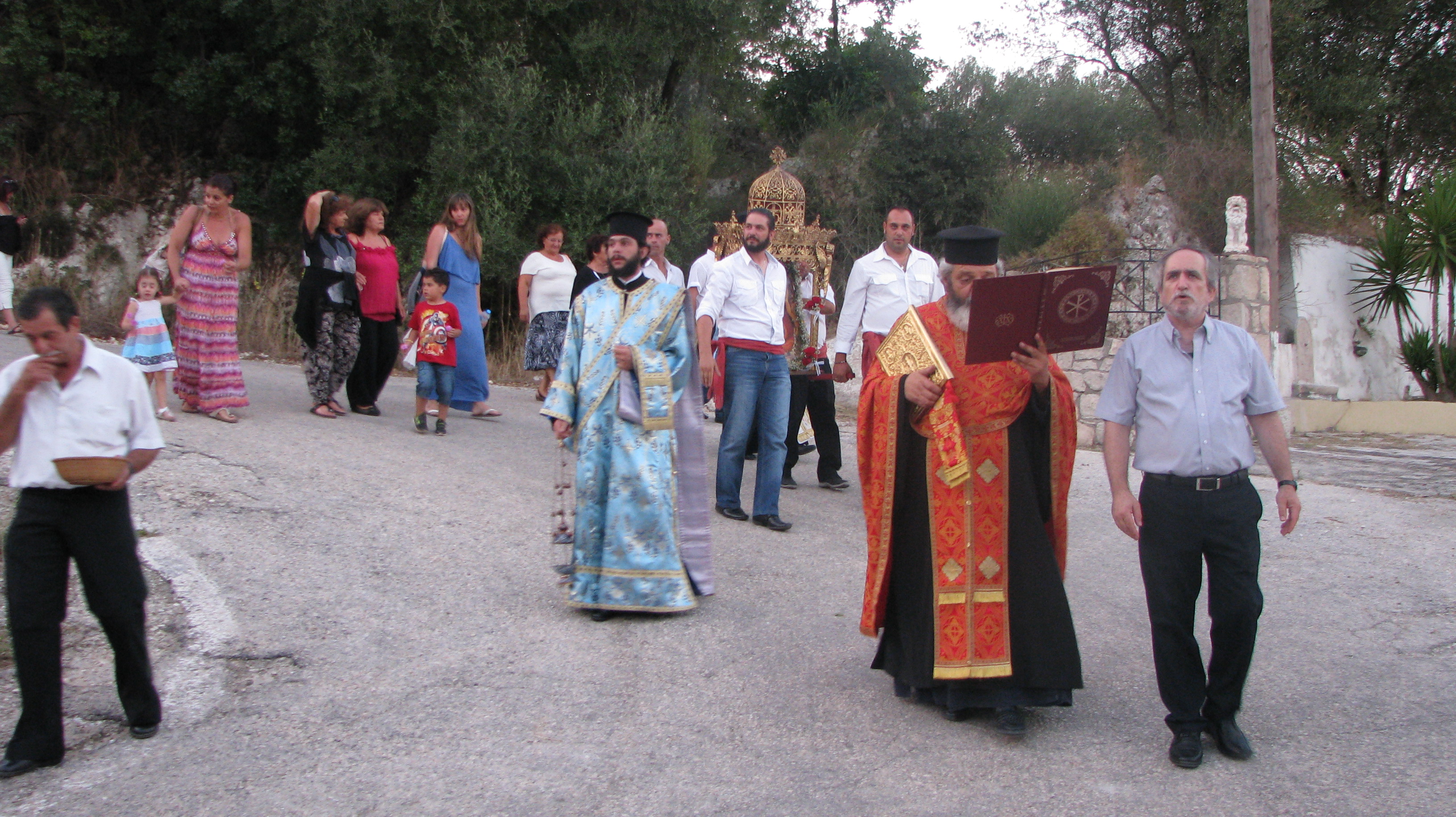 Στις 19 Ιουλίου την παραμονή, έγινε μέγας Εσπερινός με πέντε Ιερείς μεταξύ αυτών και του Αρχιμανδρίτη κ.κ Δωρόθεου ιερέα της Μητροπόλεως Περιστερίου ο οποίος είναι φίλος του χωριού μας κάνοντας τα τελευταία χρόνια διακοπές εδώ. Μαζί του ήταν και ο διάκος απο το Μεσολόγγι κ Δημήτριος .Την ψαλμωδία έκανε η θαυμάσια χορωδία του κ. Γερολυμάτου και του μαέστρου της φιλαρμονικής Ληξουρίου κ. Μινιάτη Δημοσθένη.
