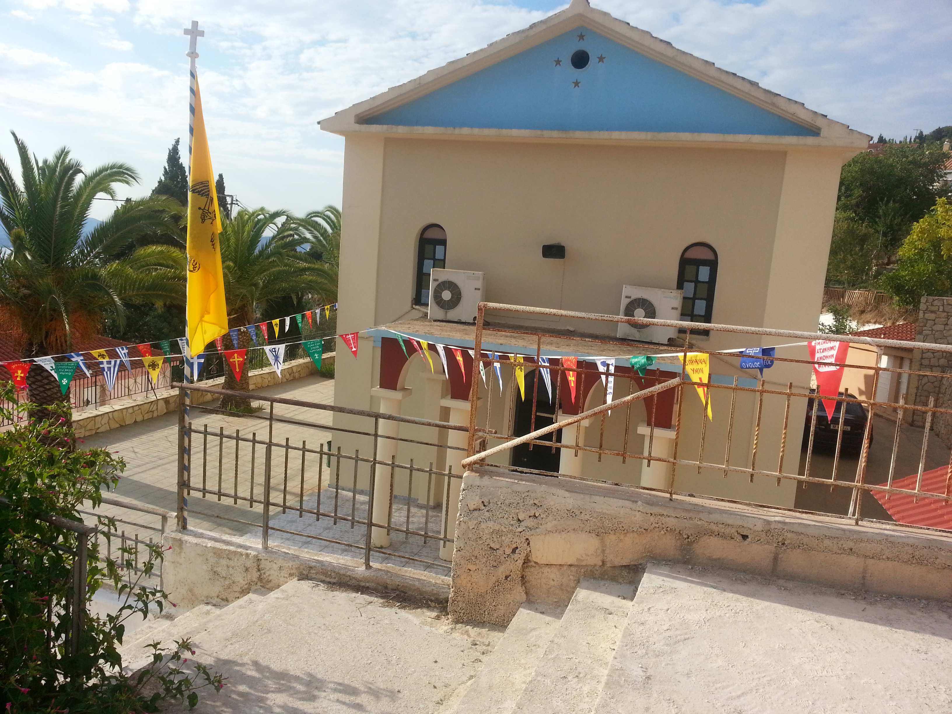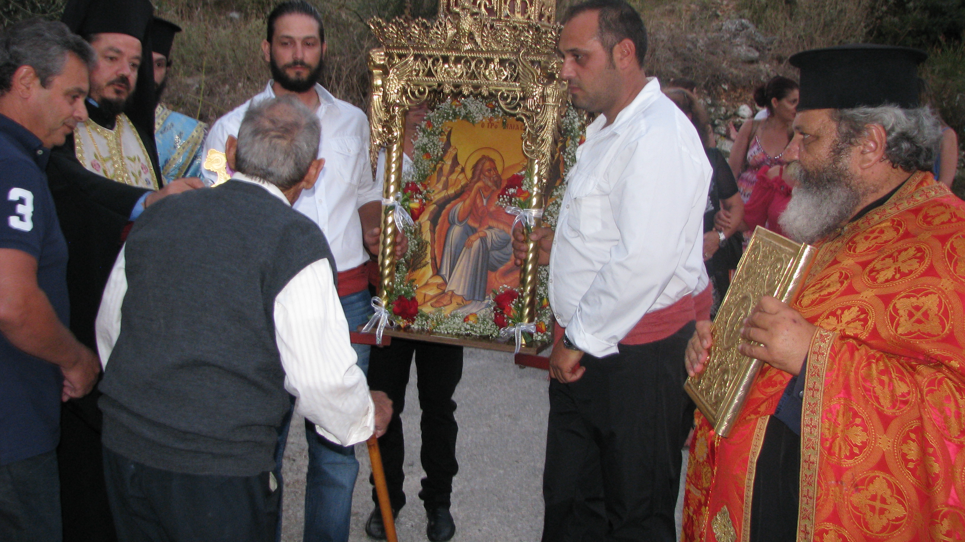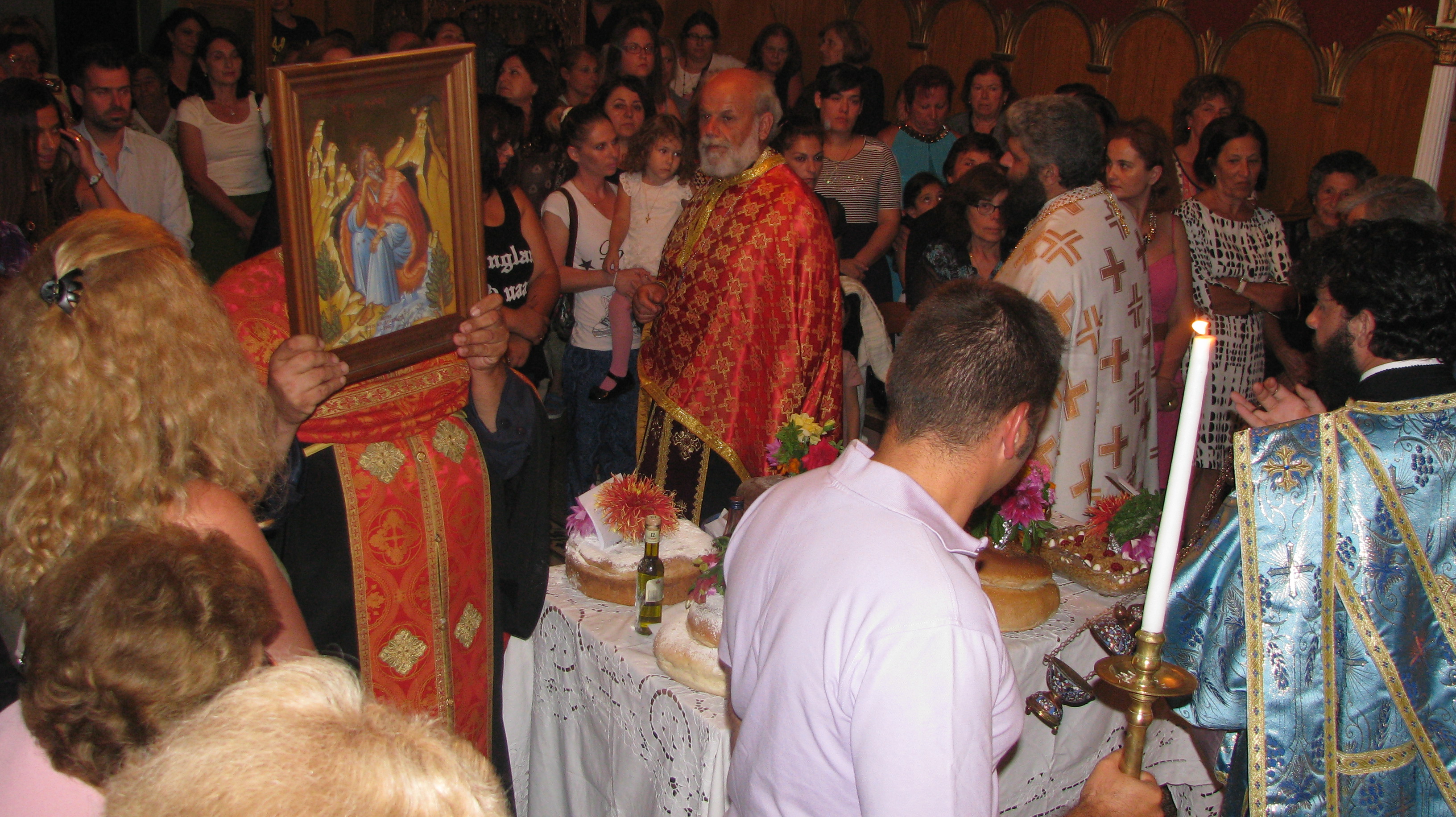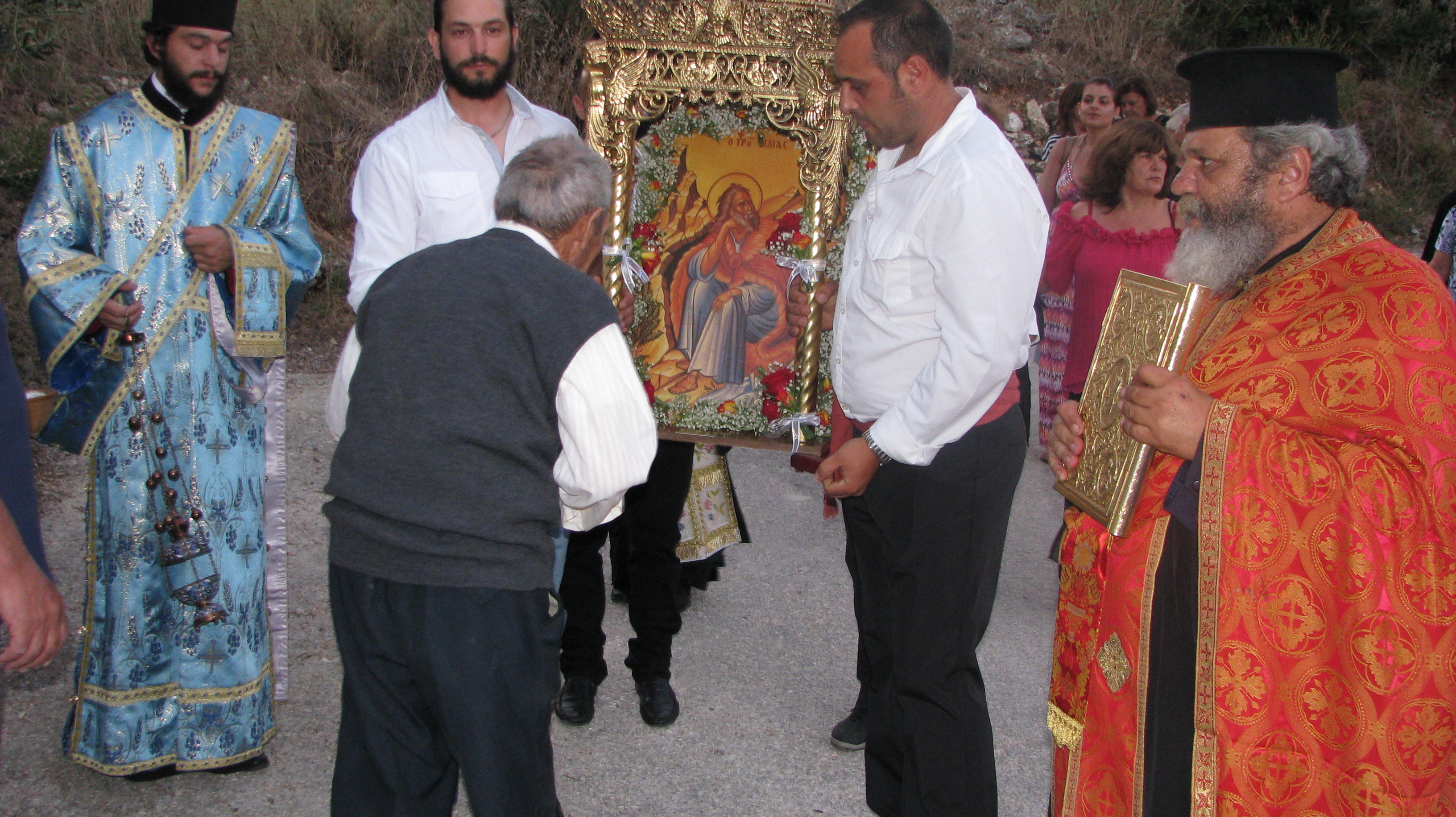Στις 19 Ιουλίου την παραμονή, έγινε μέγας Εσπερινός με πέντε Ιερείς μεταξύ αυτών και του Αρχιμανδρίτη κ.κ Δωρόθεου ιερέα της Μητροπόλεως Περιστερίου ο οποίος είναι φίλος του χωριού μας κάνοντας τα τελευταία χρόνια διακοπές εδώ. Μαζί του ήταν και ο διάκος απο το Μεσολόγγι κ Δημήτριος .Την ψαλμωδία έκανε η θαυμάσια χορωδία του κ. Γερολυμάτου και του μαέστρου της φιλαρμονικής Ληξουρίου κ. Μινιάτη Δημοσθένη.