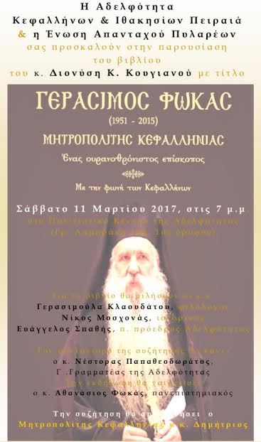 Η Αδελφότητα Κεφαλλήνων και Ιθακησίων Πειραιά & η Ένωση Απανταχού Πυλαρέων σας προσκαλούν το Σάββατο 11 Μαρτίου 2017 στις 7 μ.μ. στο Πολιτιστικό Κέντρο της Αδελφότητας (Γρηγορίου Λαμπράκη 144, 1ος όροφος) στην παρουσίαση του βιβλίου του κ. Διονύση Κ. Κουγιανού με τίτλο:
