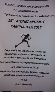 Με τη συμμετοχή πάνω από 70 αθλητών και αθλητριών πραγματοποιήθηκαν στα Καμιναράτα οι 15οι αγώνες δρόμου από το σύλλογο των Απανταχού Καμιναράδων ‘Ο Προφήτης Ηλίας’.
