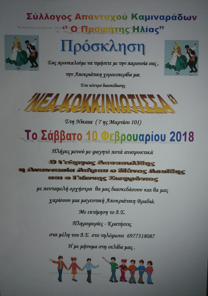 Το Δ.Σ του Συλλόγου μας καλεί τα μέλη ,τους συγχωριανούς και τους φίλους του Συλλόγου μας στην Αποκριάτικη χοροεσπερίδα μας που θα γίνει στο γνωστό κέντρο
