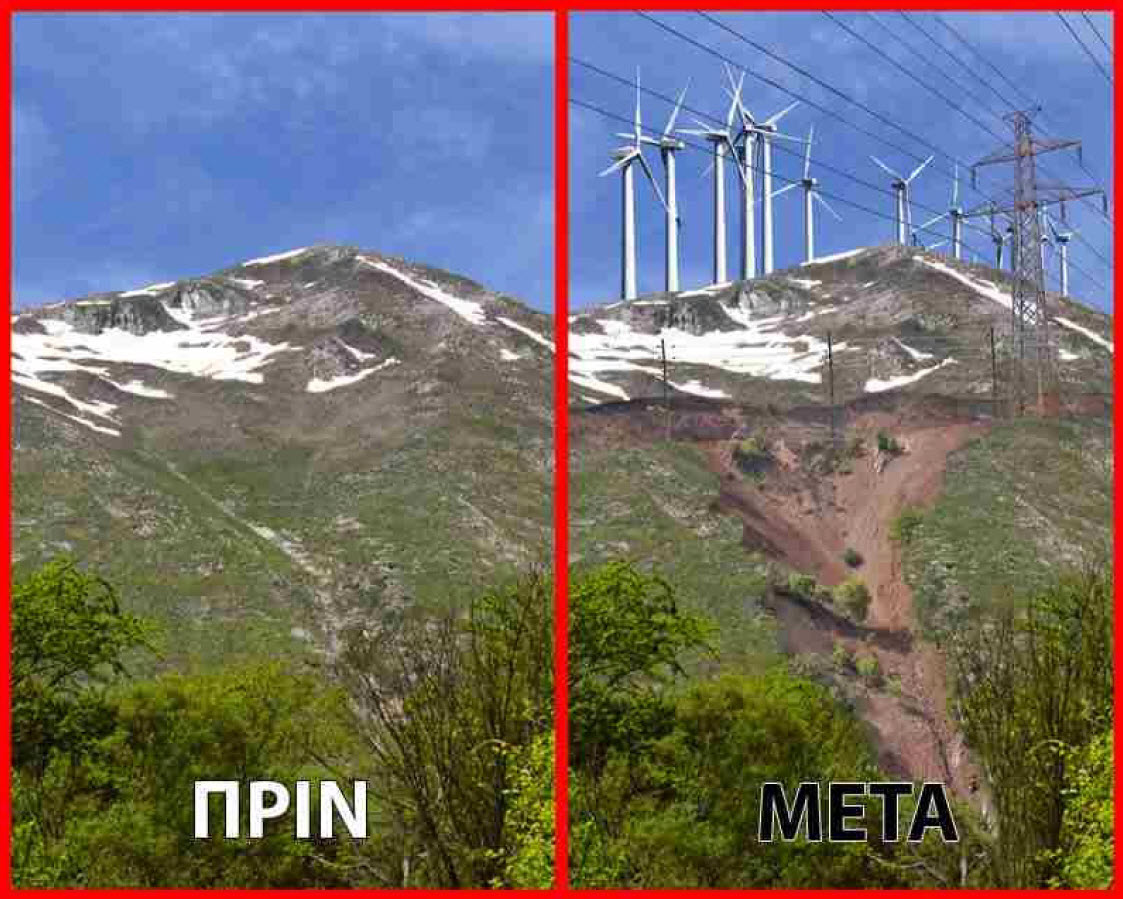 Για την θεμελίωση  πρέπει να ανέβουν φορτηγά  μήκους μεγαλύτερα των 45 μ  που είναι το μεγαλύτερο κομμάτι των ανεμογεννητριών με αποτέλεσμα να ισοπεδώνουν τα βουνά  και τα δάση. Η διάβρωση σε συνδυασμό με τον κίνδυνο πυρκαγιών από την επέκταση των ηλεκτροφόρων δικτύων,  θα αποτελεί μόνιμο κίνδυνο για τα δάση μας.  Οι εταιρείες δεν θα είναι  ούτε κατά το ελάχιστον συνεπείς  με τις υποχρεώσεις τους  για την αποκατάσταση του περιβάλλοντος  απέναντι στην καταστροφή που θα έχουν προκαλέσει.