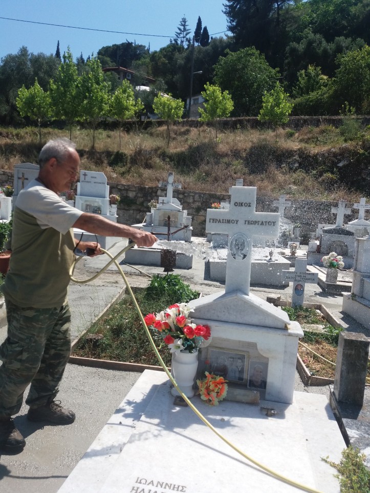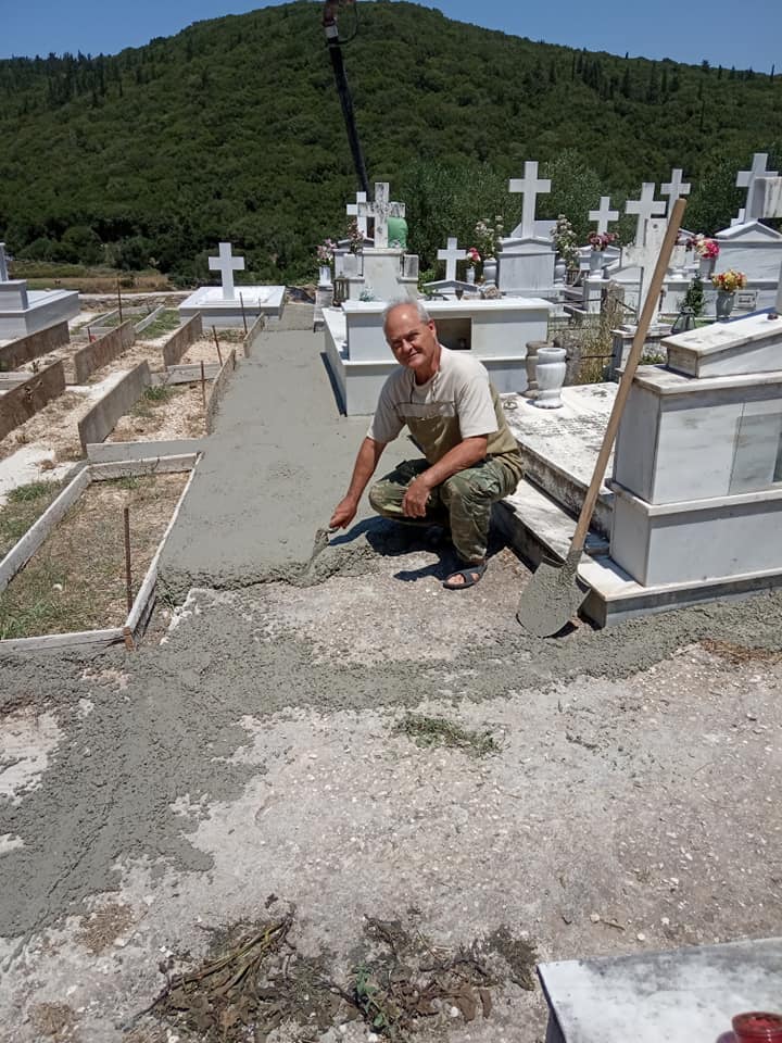 Πρώτα το Διονύση Σταθάτο τού Πέτρου που ήταν ο πρώτος που έμαθε για το στόχο της κοινότητας να πέσουν μπετά σε όλους τους διαδρόμους του νεκροταφείου και ανάλαβε να βοηθήσει με όσα αδρανή υλικά χρειαστούν.